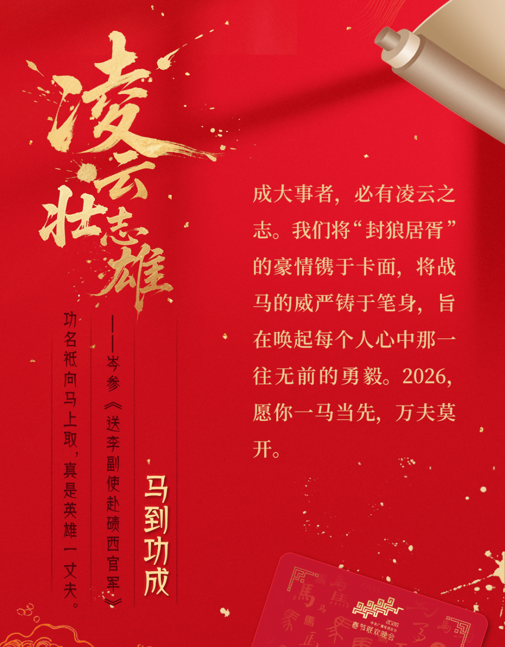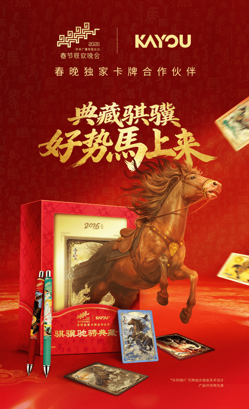 今年一大亮点,当数“骐骥驰骋典藏卡”对年轻人的新邀约。2月5日,中央广播电视总台正式官宣卡游成为2026年春节联欢晚会独家卡牌合作伙伴。这是春晚自创办以来首次设立该合作类别,标志着国家级文化盛典与新时代文创力量的深度联合,也意味着卡牌文创行业从特色文创赛道迈入主流文化消费视野。