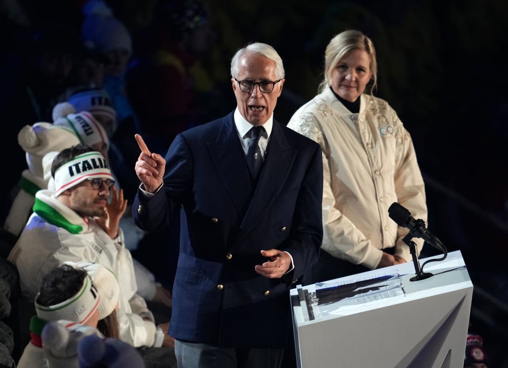 ↑米兰-科尔蒂纳丹佩佐冬奥会组委会主席乔瓦尼·马拉戈和国际奥委会主席考文垂在闭幕式上。