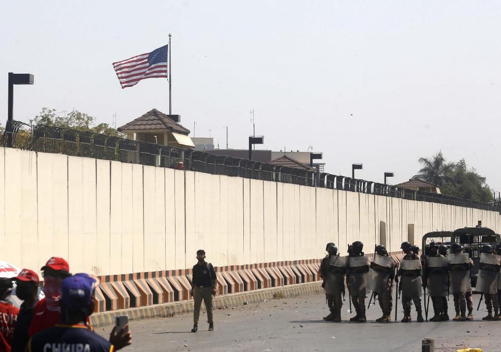 3月1日,执法人员(画面右侧)在巴基斯坦南部城市卡拉奇的美国驻卡拉奇领事馆外控制局势。新华社发(伊姆兰·阿里摄)