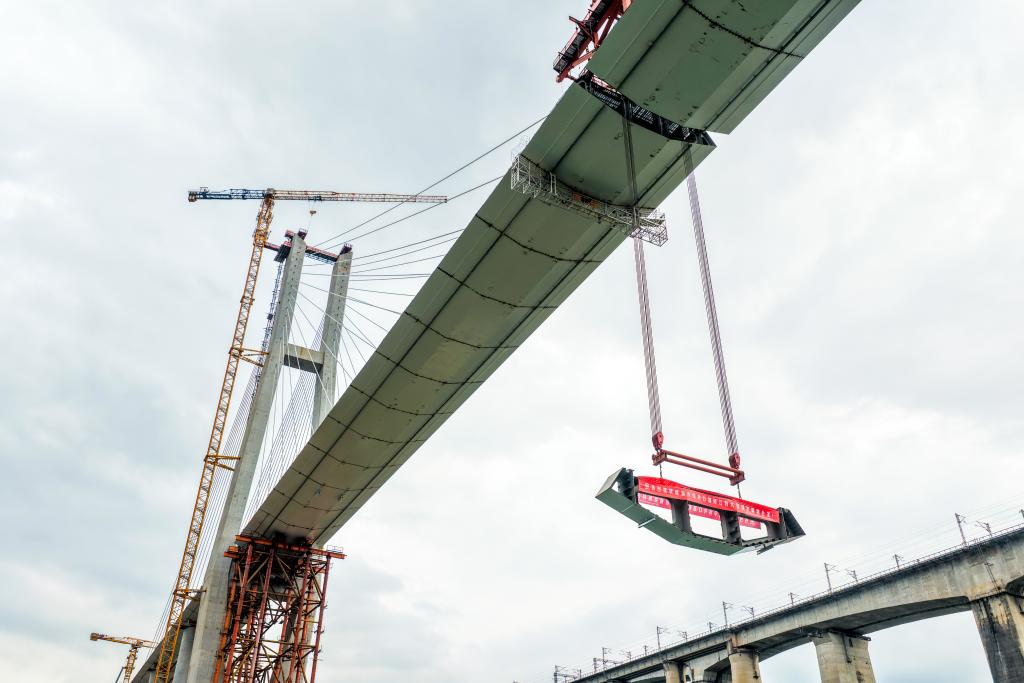 据中铁大桥局成渝中线重庆枢纽施工1标项目副经理李旺介绍,由于大桥横跨嘉陵江,为最大限度降低水位变化对架梁工期的影响,并解决线形精度控制要求高的难题,技术团队不断优化施工工艺,采用“运输+存梁+转运+吊装”的组合工艺,创造性地利用水位周期变化,在丰水期将钢箱梁提前存放,枯水期通过浮吊将钢梁转运至驳船再运输至江心指定位置,最后用200吨架梁吊机进行精准提升,确保各环节无缝衔接,有效保障了复杂水文条件下的架梁进度。