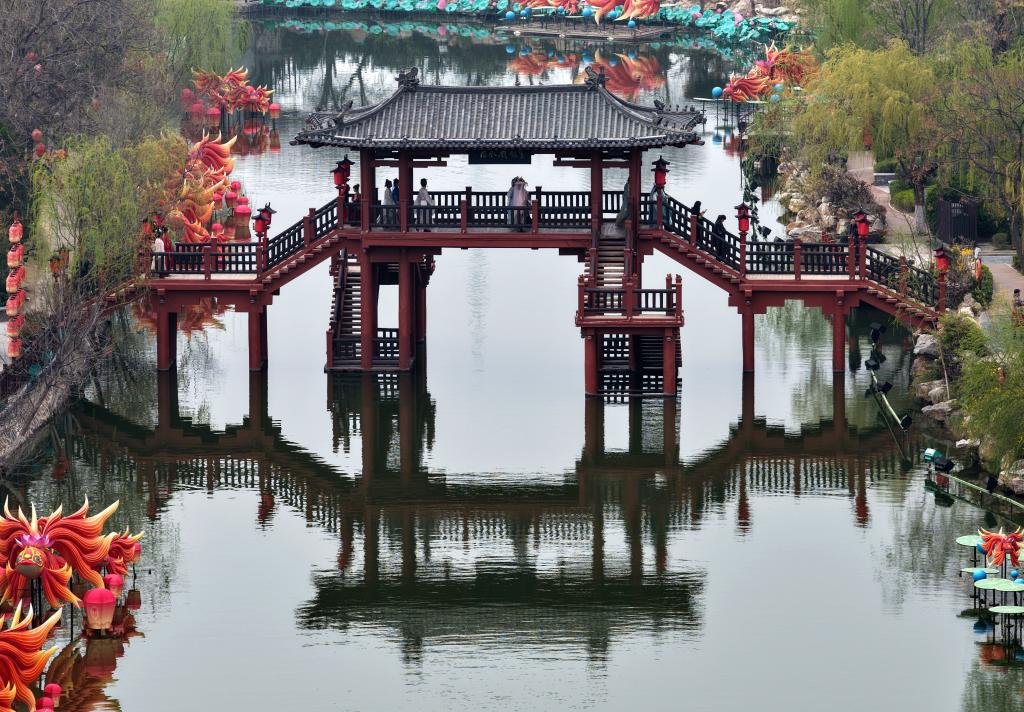 2025年3月6日,游客在开封清明上河园景区游玩(无人机照片)。新华社记者 李嘉南 摄