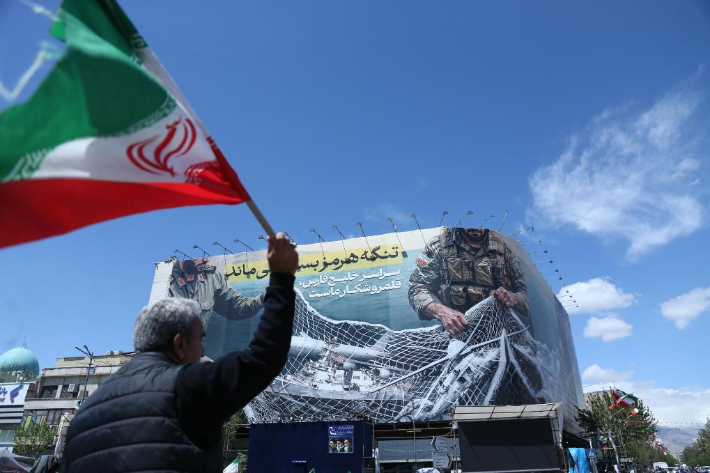 4月8日,一名男子在伊朗首都德黑兰革命广场参加集会。新华社记者沙达提摄