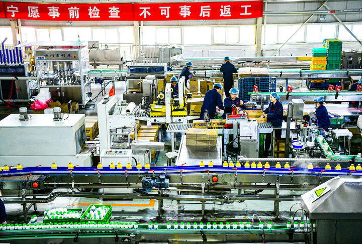 4月2日,工人在骑士乳业酸奶生产线上作业。新华社发(康文魁 摄)