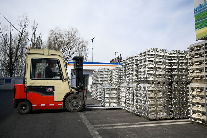 4月1日,工人在包头铝业有限公司驾驶叉车搬运铝锭。 新华社记者 李志鹏 摄