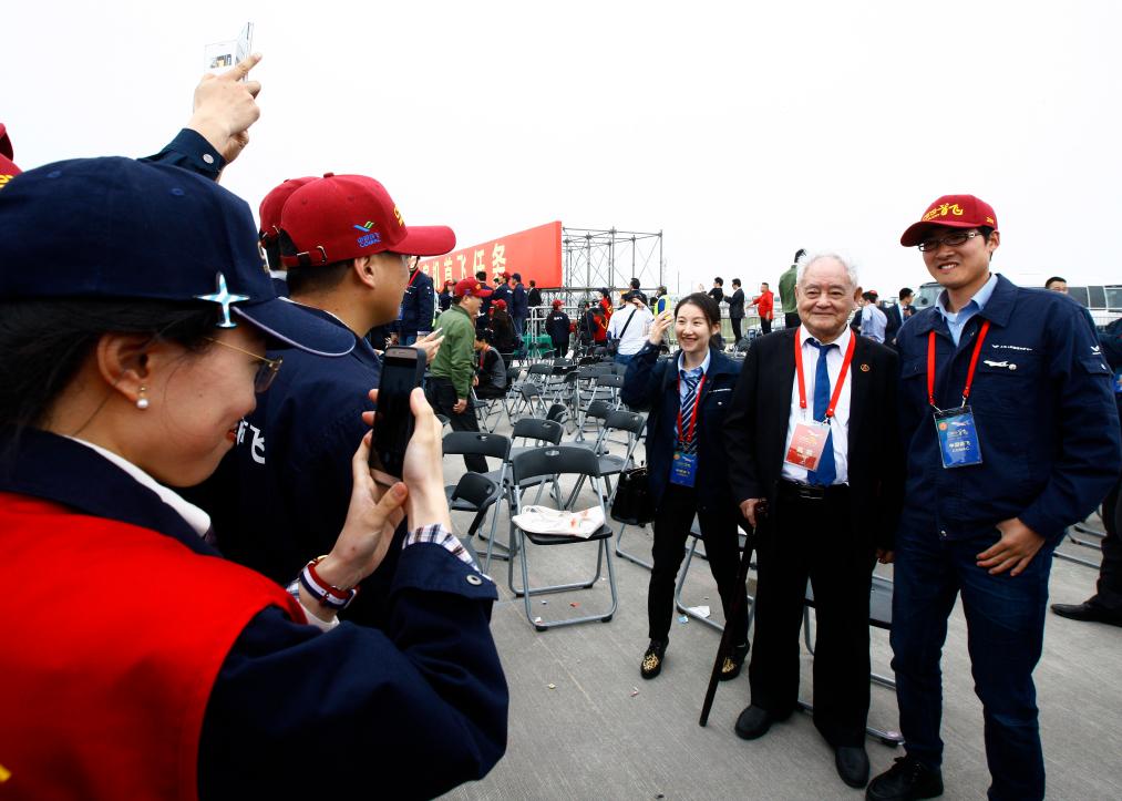 2017年5月5日,志愿者在C919首飞现场与“运-10”飞机的副总设计师程不时(右二)合影。新华社记者 方喆 摄