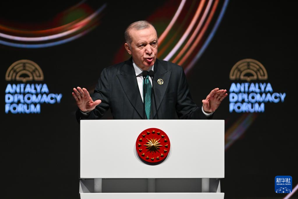 4月17日,土耳其总统埃尔多安在土耳其安塔利亚举行的第五届安塔利亚外交论坛开幕式上发表讲话。新华社发(穆斯塔法·卡亚摄)