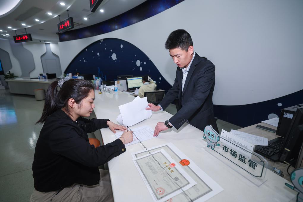 2025年4月17日,浙江省杭州市富阳经济技术开发区企业综合服务中心,助企服务专员(右)协助企业办理相关证照。新华社记者 徐昱 摄