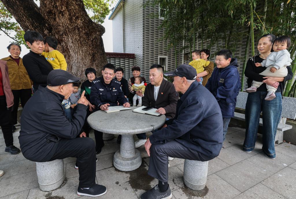 2026年4月1日,浙江省诸暨市丰江周村村干部、社区民警和村民围坐一起开议事会。新华社记者 徐昱 摄