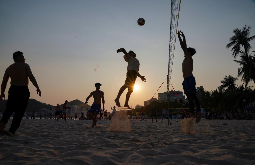 4月15日,在三亚大东海的沙滩上,人们在进行排球活动。新华社记者 胡星宇 摄