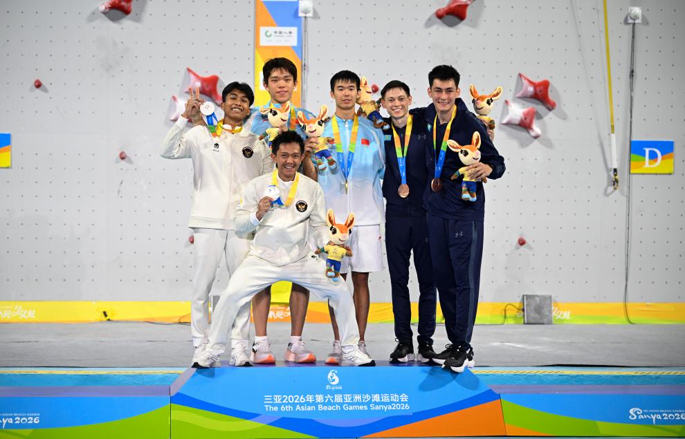 4月29日,在第六届亚洲沙滩运动会男子速度攀岩接力决赛中,中国组合赵一程/龙见国以9秒75的成绩战胜印度尼西亚组合,获得冠军。图为赵一程(左二)/龙见国(右三)、亚军拉哈贾蒂·努尔萨姆萨(左前)/安塔夏菲·罗比·阿尔·希尔米(左一)、季军哈萨克斯坦组合拉希德·海布林(右一)/里沙特·海布林在颁奖仪式上。新华社记者 贝赫 摄