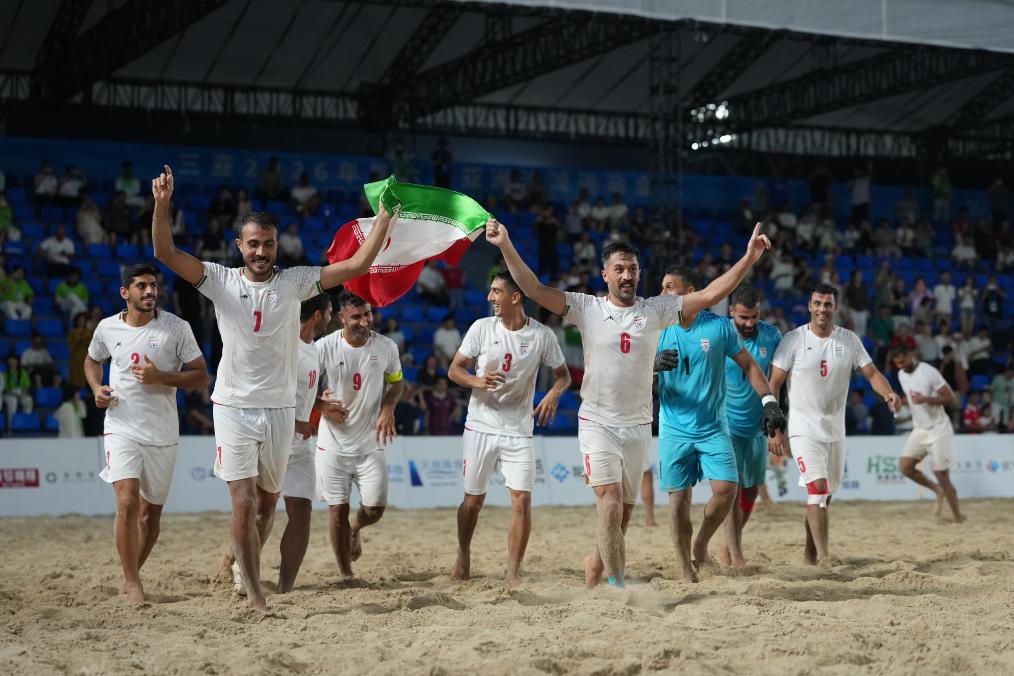 4月29日,在第六届亚洲沙滩运动会沙滩足球男子组决赛中,伊朗队6比2战胜阿曼队,夺得冠军。图为伊朗队球员在比赛后庆祝。新华社记者 潘昱龙 摄