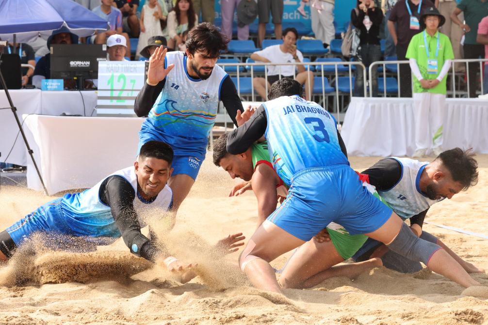 4月27日,印度队选手巴格万·贾伊(右二)在比赛中。当日,在第六届亚洲沙滩运动会沙滩卡巴迪男子决赛中,伊朗队44比31战胜印度队,获得冠军。新华社记者 朱唯希 摄