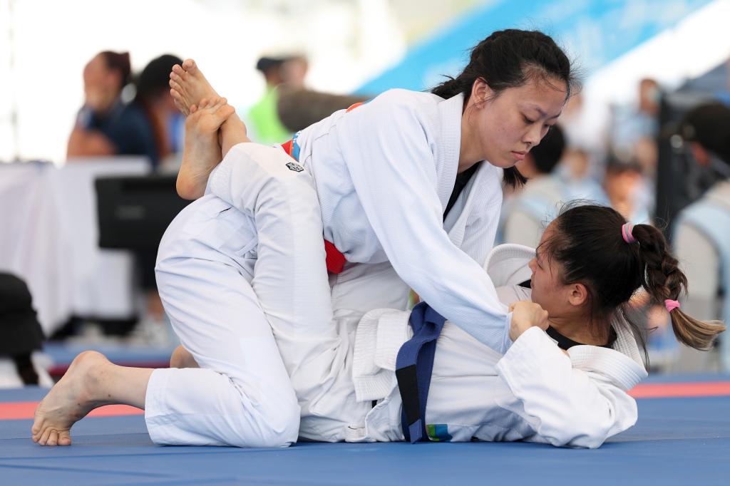 柔术队队员来自各行各业,有学生、教师,也有自由职业者。高二学生蓝宥哲、“上班族”王志毓等选手虽非专业出身,却拼满全场、毫不退缩;女队队员黄宇赛前为队友编辫子、送补给,展现了团结互助的动人风采。