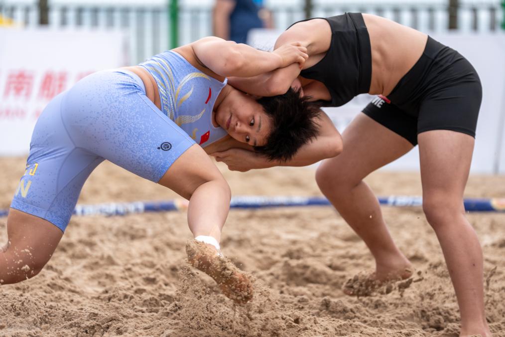 4月28日,龙佳(左)和邓氏灵在比赛中。当日,在第六届亚洲沙滩运动会沙滩摔跤女子70公斤级小组赛中,中国选手龙佳战胜越南选手邓氏灵。新华社记者 胡竞文 摄
