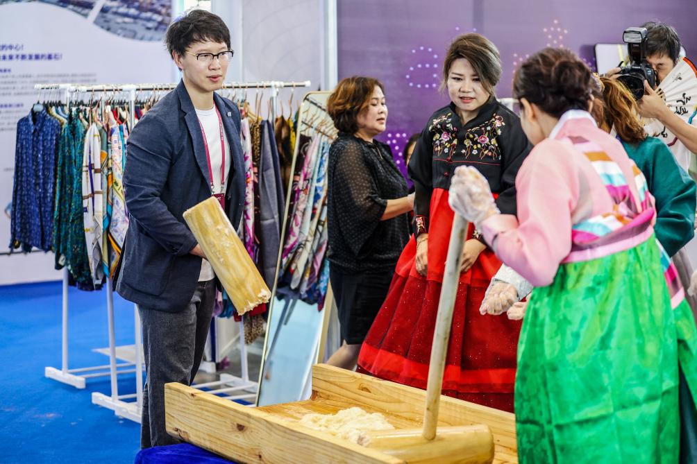 7月28日,参观者在第三届韩国(山东)进口商品博览会体验制作年糕。新华社记者 朱峥 摄
