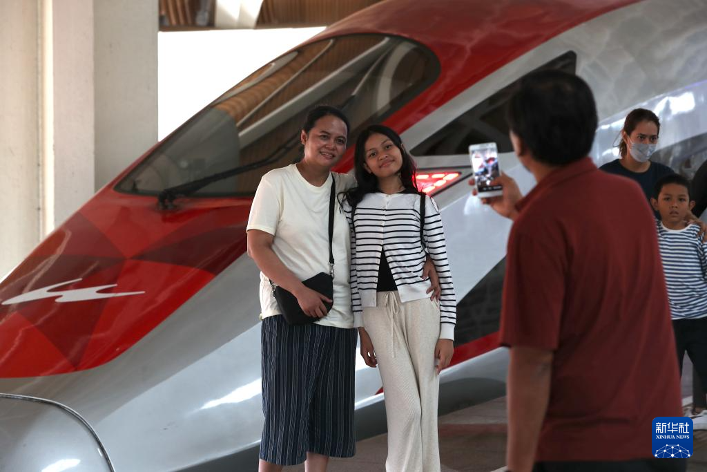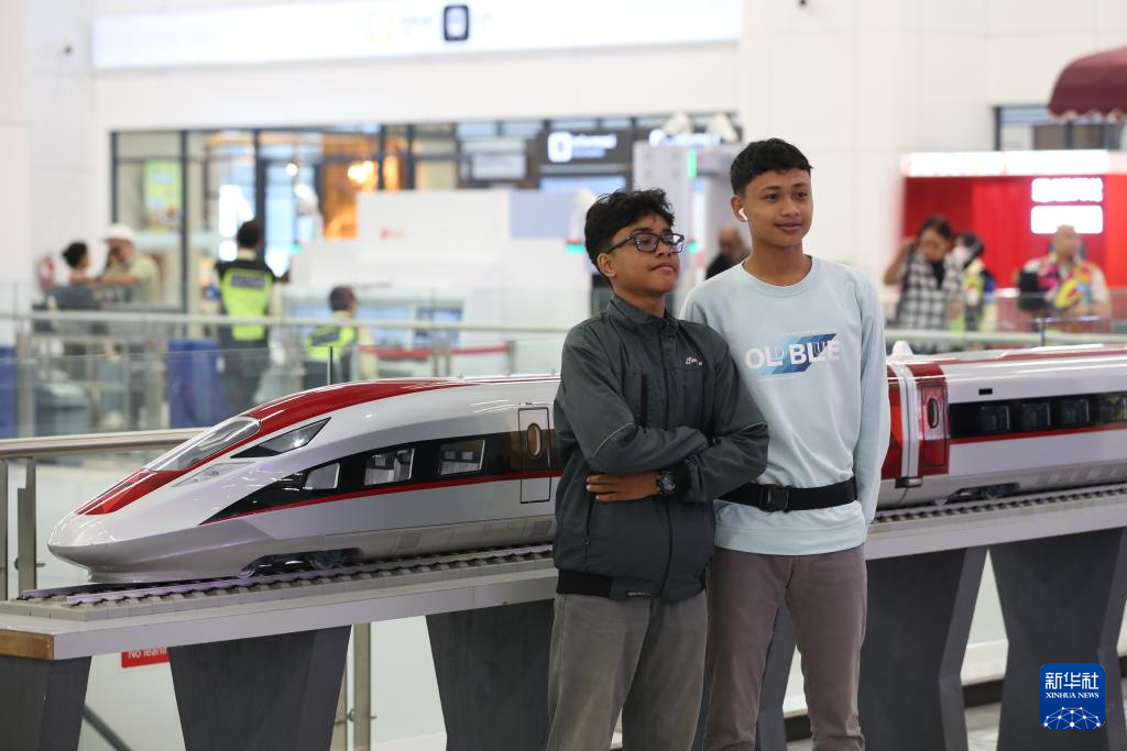 6月19日,在印度尼西亚雅加达,两名乘客在雅万高铁哈利姆站候车大厅与雅万高铁高速动车组模型合影。
