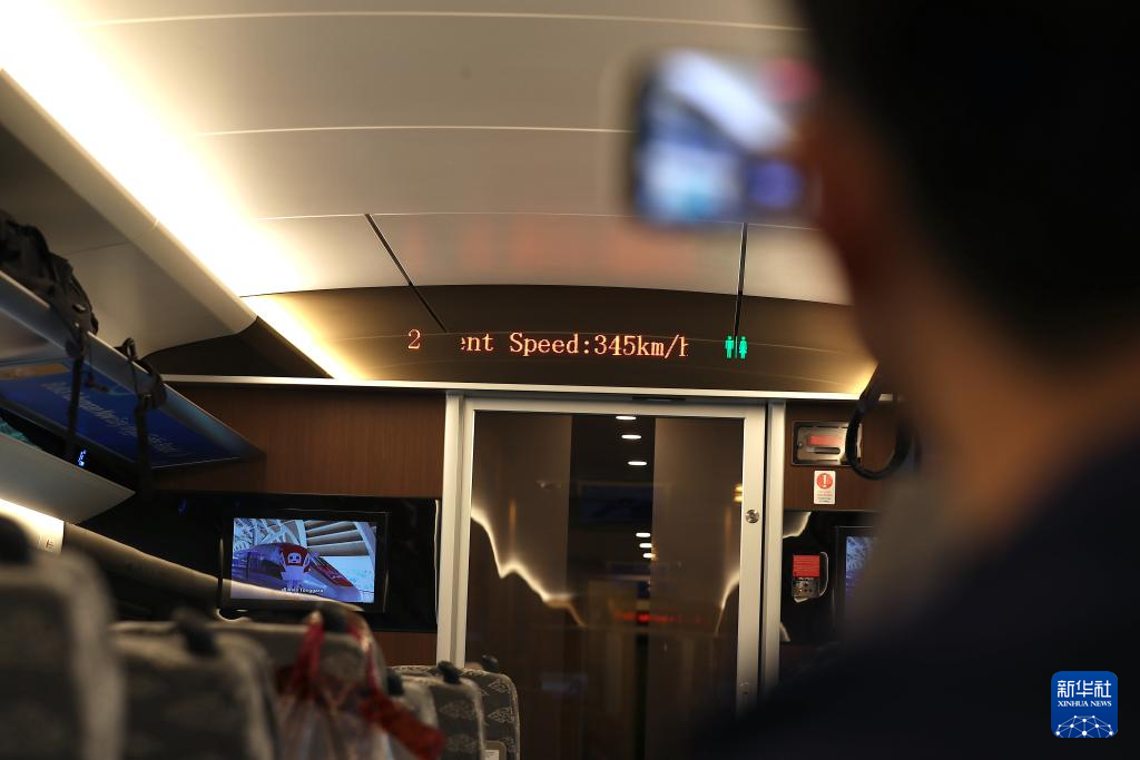 6月19日,一名乘客在行驶中的雅万高铁车厢内拍摄列车时速。