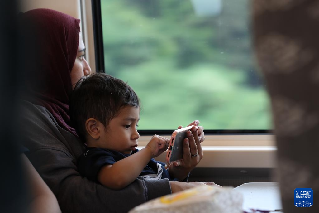 6月19日,一名乘客带孩子坐在行驶中的雅万高铁车厢内。