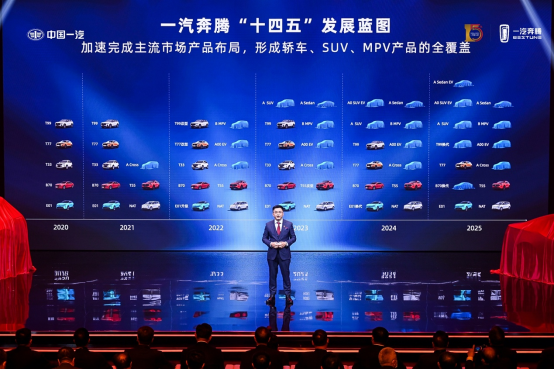 “十四五”期间,一汽奔腾将加速布局,形成轿车、SUV、MPV产品的全覆盖。在2021年内,完成SUV、轿车等6款传统能源车型的产品布局。在新能源方面,布局E01和NAT车型,实现To C与To B市场的双轨覆盖。在2023年实现品牌战略转型,产销到达30万辆;在2024年到2025年战略成长期间,以每年两款以上全新车型的推出速度,完成8款传统能源产品,以及5款新能源产品的布局,覆盖A00到B级的主流乘用车市场。达到产销60万辆的规模,并适时抓机遇,挑战百万辆经营规模。