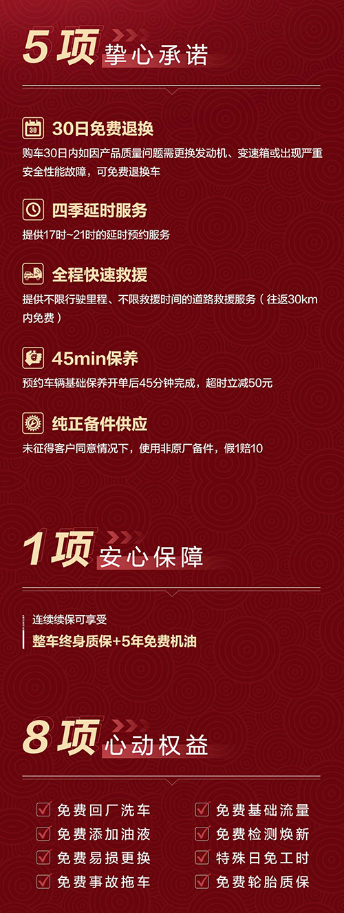 “我们推出的‘518服务权益’,应是行业最领先的,我们也是付出了很大的代价,是绝对实实在在的,货真价实的。最关键的是结合用户真正的痛点,比如30天之内出现重大故障免费退车或者换车,这是远远高于国家《三包法》的要求。《三包法》中规定出现发动机、变速箱、重大故障三次,然后在60日或者是3000公里,企业为用户提供退换车,我们是30日之内出现一次就给免费退换。好的产品,一定是好的服务跟上。”