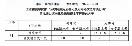 近日,工业和信息化部“互联网应用适老化及无障碍改造专项行动”公布了首批通过适老化及无障碍水平评测的APP,百度地图及百度地图“关怀版”成为首批通过评测的APP。