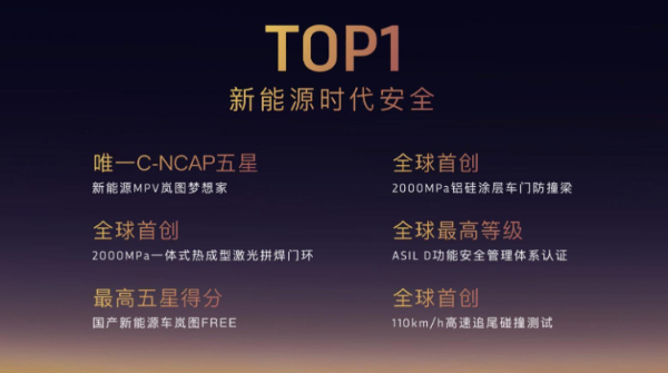 岚图为保障用户安全不断刷新标准,现已拥有领先行业的69项标准,还致力于打造全域安全,树立全球安全标杆。岚图不仅做到了行业唯一的MPV C-NCAP五星认证,还开创了众多全球领先的安全技术。如全球首创2000MPa一体式热成型激光拼焊门环,1500MPa的高强度钢底护板,还专门针对后排乘客安全通过了超美标时速110公里追尾后碰测试等。