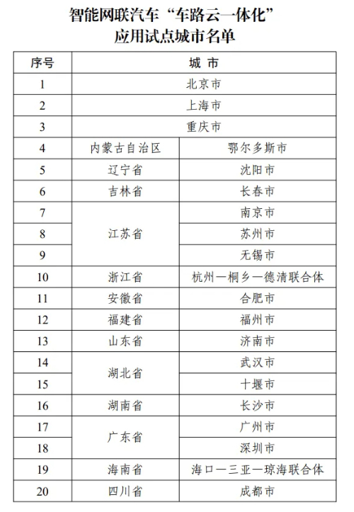 据介绍,按照《工业和信息化部 公安部 自然资源部 住房和城乡建设部 交通运输部关于开展智能网联汽车“车路云一体化”应用试点工作的通知》(工信部联通装〔2023〕268号)安排,在自愿申报、组织评估基础上,确定了20个城市(联合体)为智能网联汽车“车路云一体化”应用试点城市。