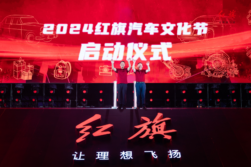 中国一汽董事长、党委书记邱现东(图中右)参与2024红旗汽车文化节启动仪式
