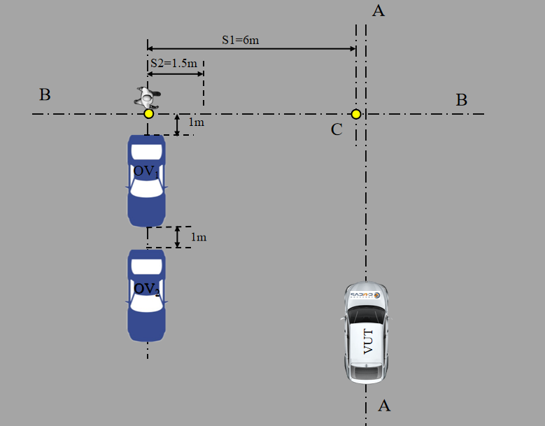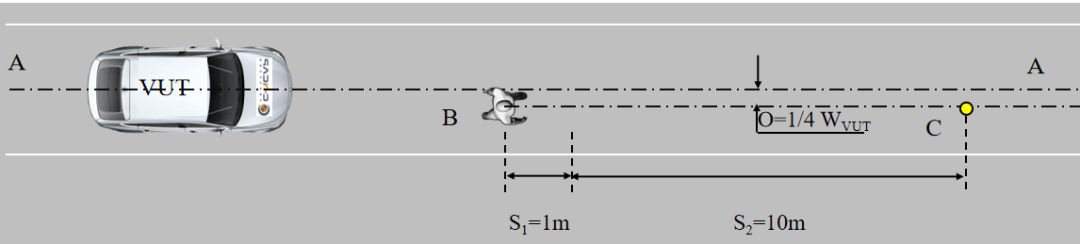该场景为新增场景,难度较高,主要考察车辆系统对于近端横穿儿童目标物的识别和目标物运动轨迹的判断能力,由于障碍车的存在,导致目标物在到碰撞点前,会消失在试验车的“视野”内一段时间,再加上儿童目标物尺寸本身较小且从近端出现,对车辆的感知和响应能力要求更高。特别对于高速测试点,留给车辆系统的反应时间很少,难度较大。