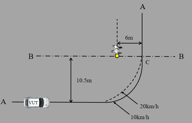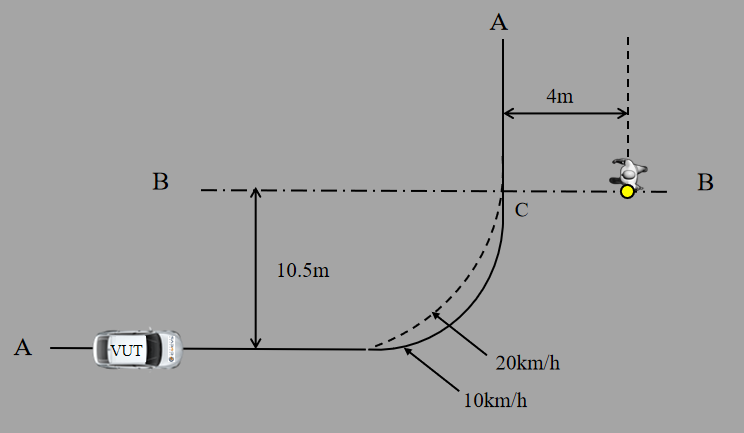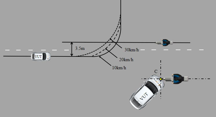 CPTA-LN场景下,行人以5km/h的速度自相对车辆行驶方向的右侧向左侧移动。VUT分别以10km/h、20km/h、30km/h的速度左转测试。碰撞位置在50%处。