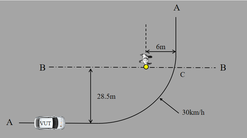CSTA-LN场景下踏板摩托车以20km/h的速度以与车辆行驶方向相反的方向移动。VUT分别以10km/h、20km/h、30km/h的速度测试。碰撞位置在50%处。该场景主要考察车辆系统在左转弯过程中,对相邻车道对向驶来的踏板摩托车的识别及响应能力。