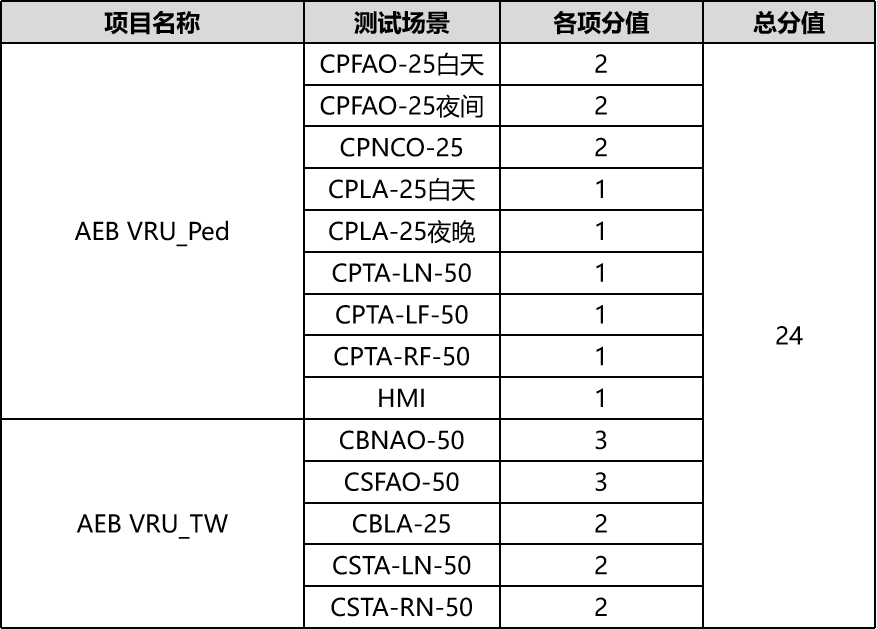 AEBVRU测试部分可获得的最高总分值为24分,其中AEBVRU_Ped和AEBVRU_TW两大类各占50%。各测试场景最高分值如下图所示: