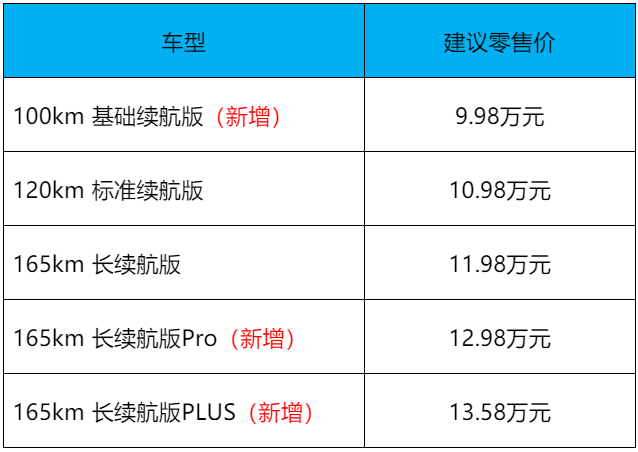 另外,售价仅9.98万元的基础续航版,纯电续航达100km。而165km长续航Pro版、165km长续航PLUS版则为具有进阶需求的用户提供了更多丰富的配置选择。