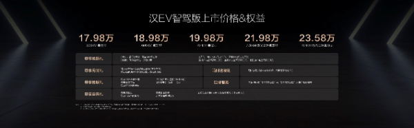 其中,汉DM-i智驾版共推出5款车型,售价16.88万-22.58万元;汉EV智驾版共推出5款车型,售价17.98万-23.58万元,开创B+C级轿车全民智驾,加配不加价!