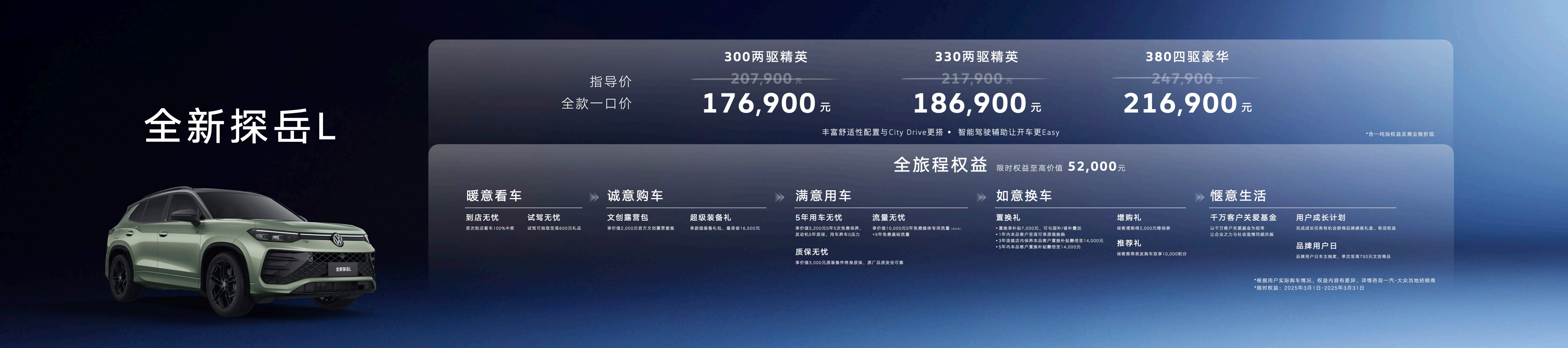 3月1日,正值“龙抬头”,一汽-大众全新探岳L在五岳之首泰山震撼上市,新车共推出300TSI、330TSI、380TSI三种动力配置共3种车型,官方指导价20.79万元起,可选装舒适性配置丰富的City包和驾驶辅助功能Easy包。现在购买全新探岳L,还将享受17.69万元起的全款一口价。