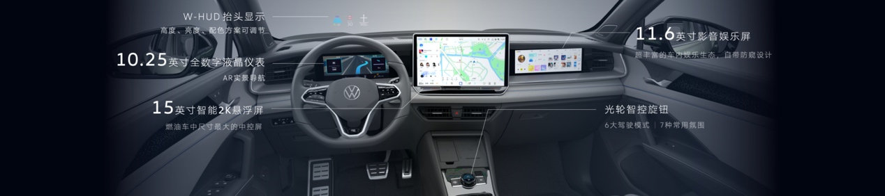 基于“好用”和“想用”的理念,全新探岳L智能座舱以5+X多屏多模交互系统为核心。其中,“5”即5块屏幕,包含了15英寸2K中控屏、11.6英寸副驾影音娱乐屏,搭配丰富的车内娱乐生态,灵动又默契;另外,10.25英寸全数字液晶仪表,能实现AR实景导航,导航信息与实景路面融合,让驾驶更加专注;抬头显示HUD,安全好用;可触摸光轮智控旋钮,调节音量和切换驾驶模式,更加便捷。