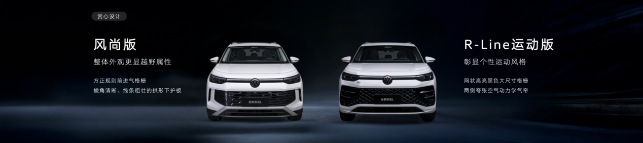 外观造型上,为满足当下用户多元化的审美需求,全新探岳L提供两种前脸设计。其中,风尚版车型的前脸方正且规则的进气格栅,辅以棱角清晰、线条粗壮的拱形下护板,整体外观更显越野属性。相比之下,R-Line运动版则采用了品牌标志性的网状、高亮黑、大尺寸格栅,与两侧夸张的空气动力学气帘相得益彰,赋予车辆更凌厉气质,充分彰显个性运动风格。