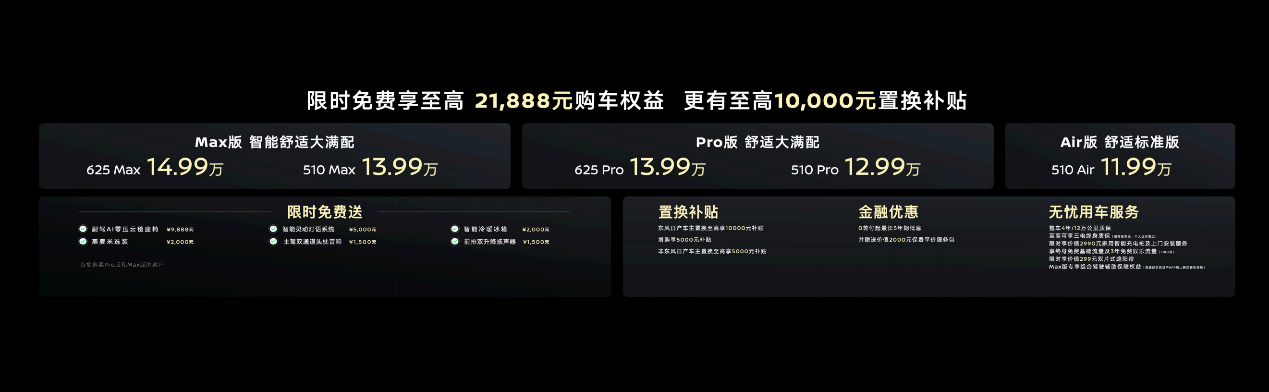 不仅如此,对于首批购买Pro版和Max版的用户,东风日产限时送出至高21888元的购车权益,包括副驾AI零压云毯座椅,科技选装包(智能灵动灯语系统、主驾双通道头枕音响、前排双升降扬声器),智能冷暖冰箱,以及燕麦米灵感车色。此外,东风日产还发布了诚意满满的购车权益,包括至高10000元置换补贴、0首付起最长5年期低息金融优惠、以及涵盖质保、充电、用车等方面的无忧用车服务,具体权益和政策可咨询东风日产当地专营店。