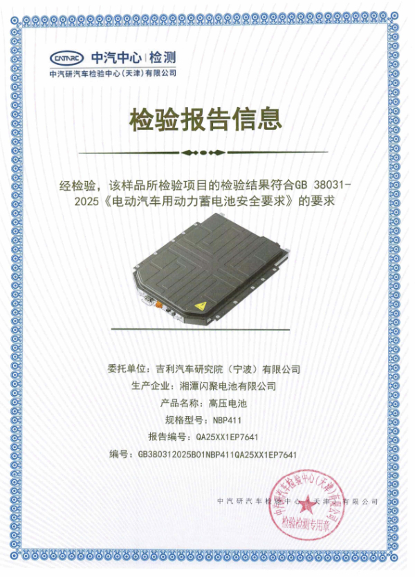 另据了解,吉利汽车于5月8日获得GB 38031-2025《电动汽车用动力蓄电池安全要求》检测报告,成为国内首批通过电池安全新国标的企业。检测报告由权威第三方检测机构中汽研汽车检验中心颁发,而依托独有的神盾电池安全系统,所有新国标安全验证吉利均一次性通过。