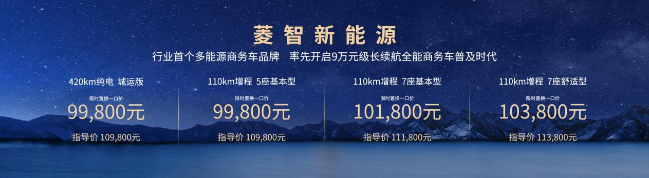 发布会上,菱智家族正式发布全新新能源产品矩阵,涵盖纯电、增程双技术路线版本。其中,菱智新能源420km纯电城运版,售价为10.98万元,限时置换一口价9.98万元;菱智新能源110km增程版,售价为10.98-11.38万元,限时置换一口价9.98-10.38万元。2025年6月30日前订车的首批客户赠送价值1500元的10寸液晶大屏,以及对行驶里程超过10万公里的车辆,赠送基础保养1次,助力中小微创业者跑出“创富加速度”。