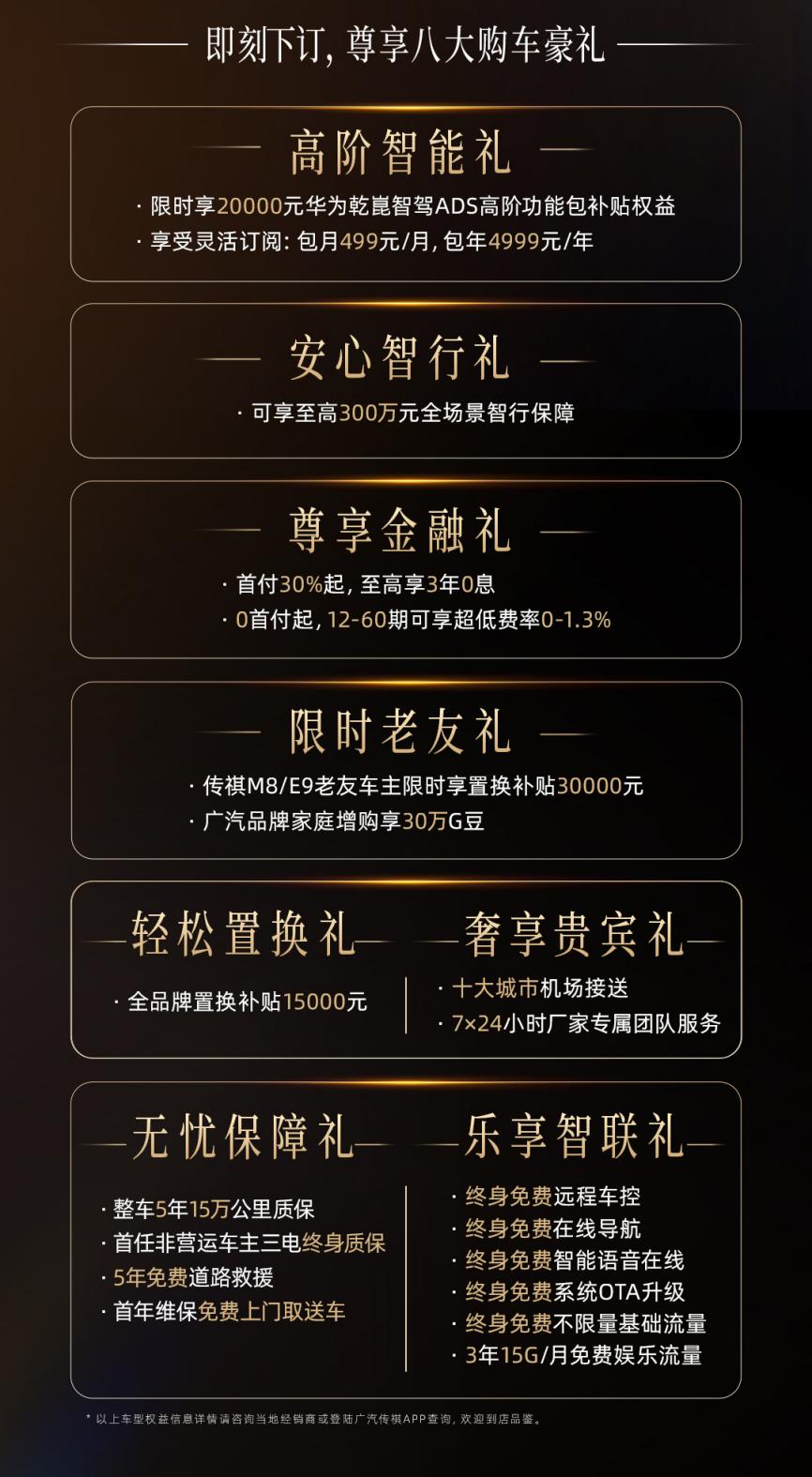 现在下订,即可尊享八大购车豪礼,包括:2万元华为乾崑智驾ADS高阶功能包补贴权益;全品牌置换立享15000元,老车主置换补贴直接翻倍高达3万元;还有至高300万元全场景智行保障、0 首付或 0 利息两种金融方案、三电终身质保、终身不限量流量包等权益。