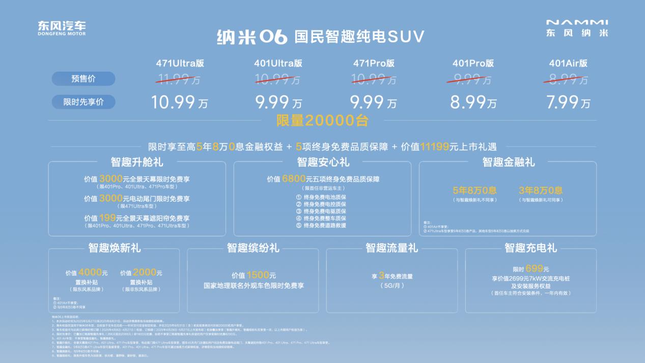 5月27日,东风纳米旗下“国民智趣纯电SUV”东风纳米06在武汉正式上市,限时先享价为7.99万元-10.99万元。作为一个听劝的品牌,东风纳米06为用户带来7大诚意权益,包括电动尾门和全景天幕限时送、五项终身免费品质保障、中国国家地理联名外观车色限时免费享、最高4000元置换补贴、至高享“5年8万0息”、送3年免费流量、699元享价值2699元充电桩及安装服务等众多的超有诚意权益。