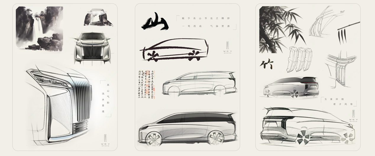 长城汽车以“内外兼修”的东方美学为根基,将“大气”具象为魏牌全新高山的设计语言。正面重构“飞瀑流水”的磅礴意境;侧面腰线气脉贯通;尾灯凝练“茂林修竹”的诗意,在刚劲线条与写意留白间达成平衡。实现从具象意象到意境感悟的升华,让工业美学再现东方哲学的时空纵深。