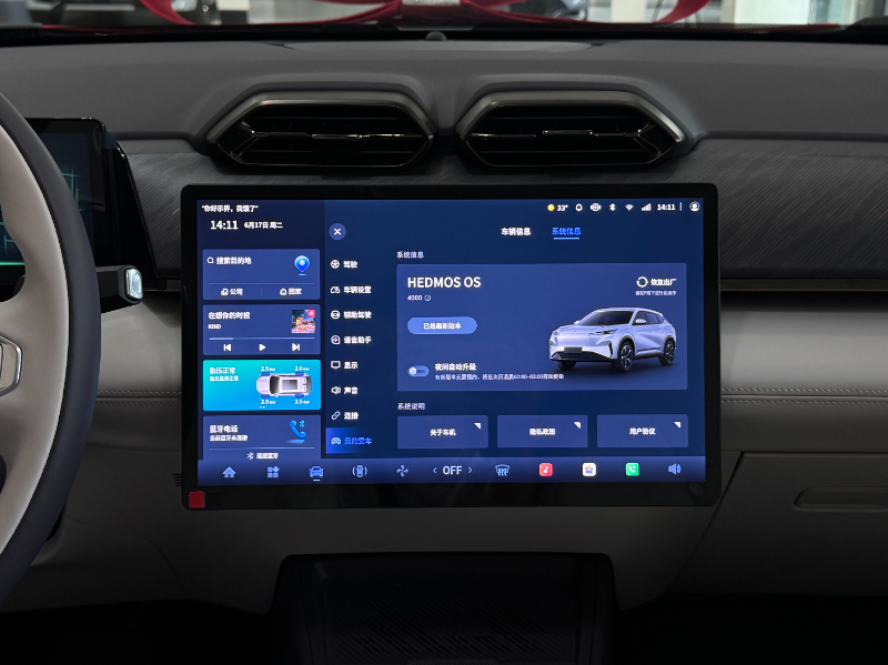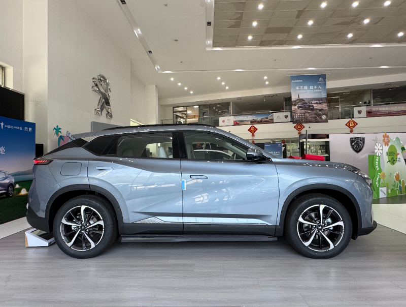 机舱盖前端中央的 “HEDMOS 示界” 车标,灵感源自 “指北罗盘针”,寓意着品牌在新能源领域不断探索前行的决心。前包围两侧的黑色进气口造型独特,与细长的大灯组相互搭配,营造出强烈的运动化视觉冲击力。