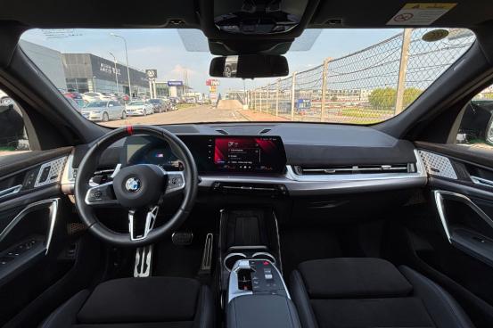 车身侧面以4554mm车长与2692mm轴距构建出修长比例,溜背式车顶线条与半隐藏式门把手设计,使风阻系数低至0.27Cd。M35i xDrive版本标配21英寸双色轮毂,搭配红色M高性能卡钳与蓝色缝线装饰,侧裙导流槽深度较前代提升17%,配合尾部扩散器形成完整空气幕系统,实测120km/h风噪较奔驰GLA降低2.1分贝。