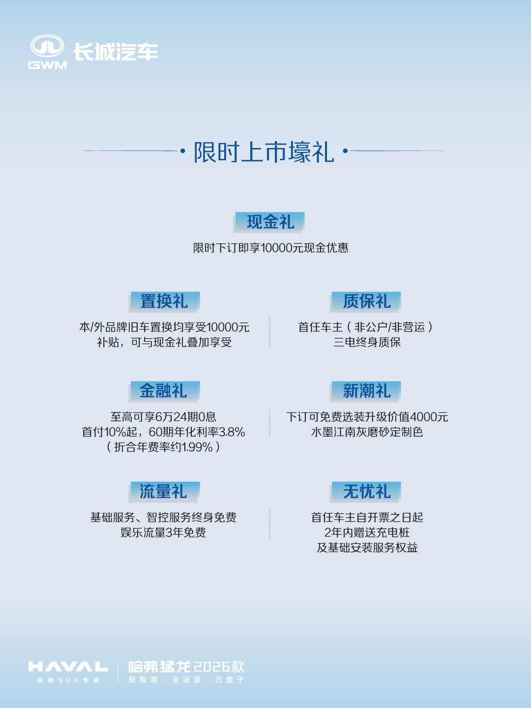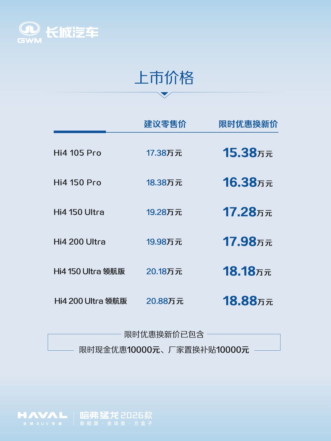 8月19日,哈弗猛龙2026款上市。新车共推出6款车型,建议零售价17.38万元-20.88万元。即日起至9.30购车,可享现金礼10000元 ,置换礼10000元(可与现金礼叠加),限时优惠换新价15.38-18.88万元。另享金融礼、新潮礼、流量礼、无忧礼等限时壕礼。