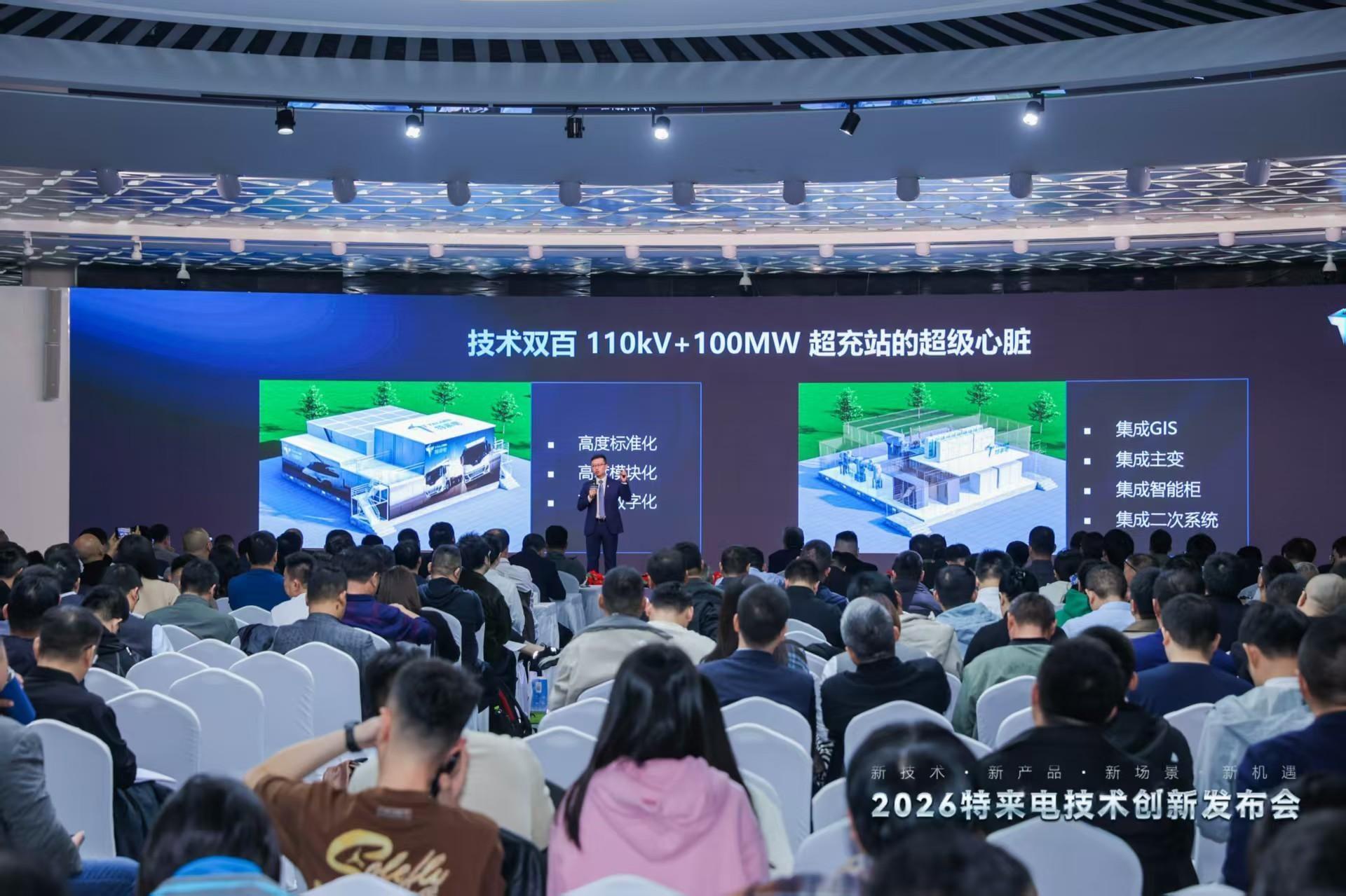 “一个预制舱,就是一座超充变电站!”110kV高压100MW数字化超充站是行业首个实现110kV电压等级集成的超充站,其核心创新在于将传统变电站核心高压部分高度集成至预制舱内,让超充站可直接接入电网主干,跳过多级电压转换环节,大幅减少能量损耗,重新定义了变电站的形态与边界。