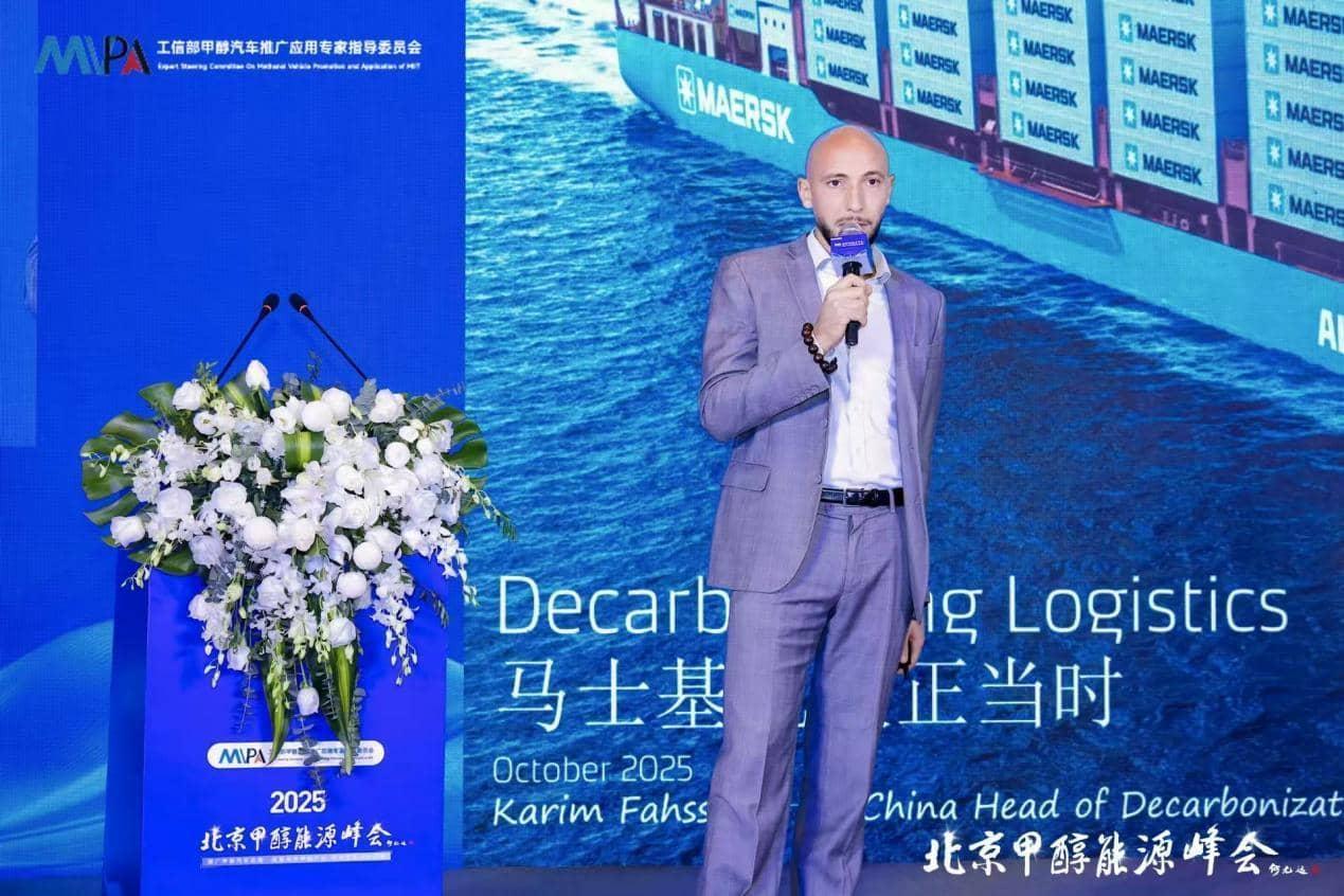 马士基集团中国脱碳运营总监卡卡介绍了马士基船用燃料的使用。他表示,马士基于2022年1月宣布加速脱碳进程,力争2040年实现净零排放,同时确定2030年中期目标,并于2022年3月宣布6家绿色甲醇合作单位,10月订购6艘以绿色甲醇为燃料的大型集装箱船舶,预计2025年开始交付。