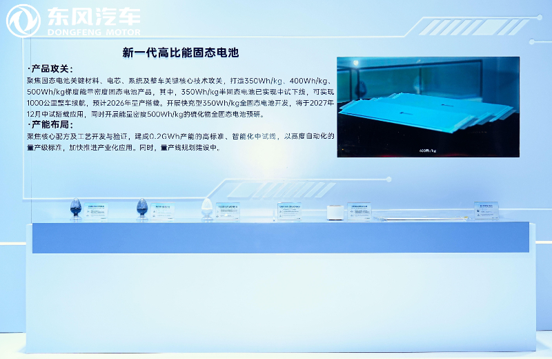 本次大会上,东风汽车展出了新一代全自主高比能固态电池。该电池采用高容量三元正极、硅碳负极与氧化物聚合物复合固态电解质的多组分体系,其能量密度达350Wh/kg,解决了传统锂电池在安全与低温性能上的痛点。该电池在-30℃ 的极寒环境下,能量保持率仍高达72%以上;在安全性能上,成功通过了170℃热箱安全试验,远超国标130℃的要求,展现出极高的热稳定性和本质安全性。目前,东风汽车已建成0.2GWh固态电池中试线并投入使用,预计350Wh/kg固态电池将于2026年9月正式量产上车,届时将助力整车实现1000公里的超长续航,为用户带来真正无续航焦虑的出行体验。