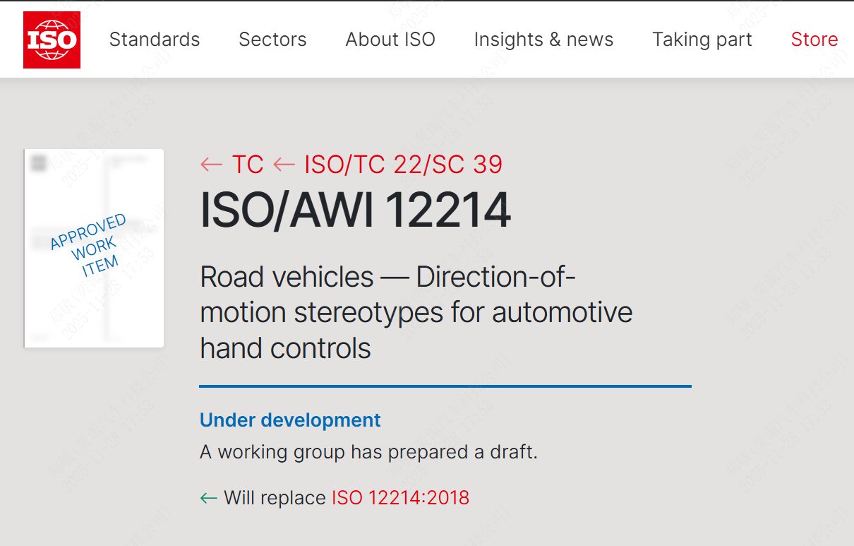 11月26日,ISO(国际标准化组织)传来消息,由中国牵头制定的ISO 12214《道路车辆+汽车手控装置常规运动方向》国际标准正式注册立项,东风汽车集团有限公司(以下简称东风汽车)负责技术牵头。这不仅是东风汽车长期深耕标准化工作的突出成果,也是中国汽车行业在国际标准制定上从“跟跑”到“领跑”的重要跨越。